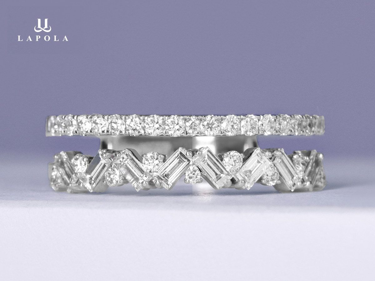 Nhẫn kim cương tại Lapola Jewelry được thiết kế với hàng viên chủ chữ nhật với cấu trúc xếp tầng xen kẻ viên kim cương tròn đặc biệt, kết hợp kiểu thân nhẫn được chế tác tỉ mỉ, đường song song đính kim cương tròn thu hút chính là món quà ý nghĩa dành cho các nàng cá tính.